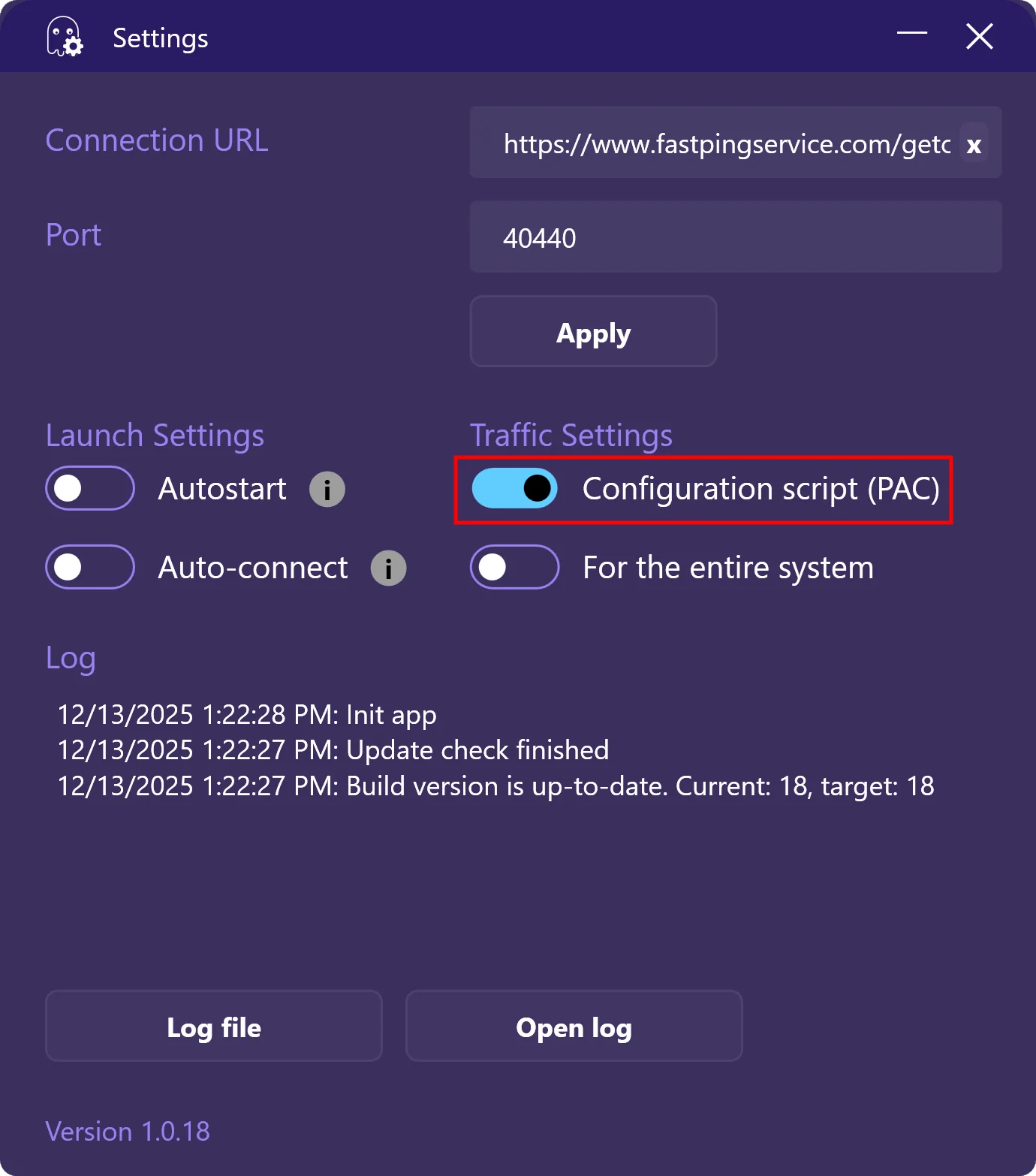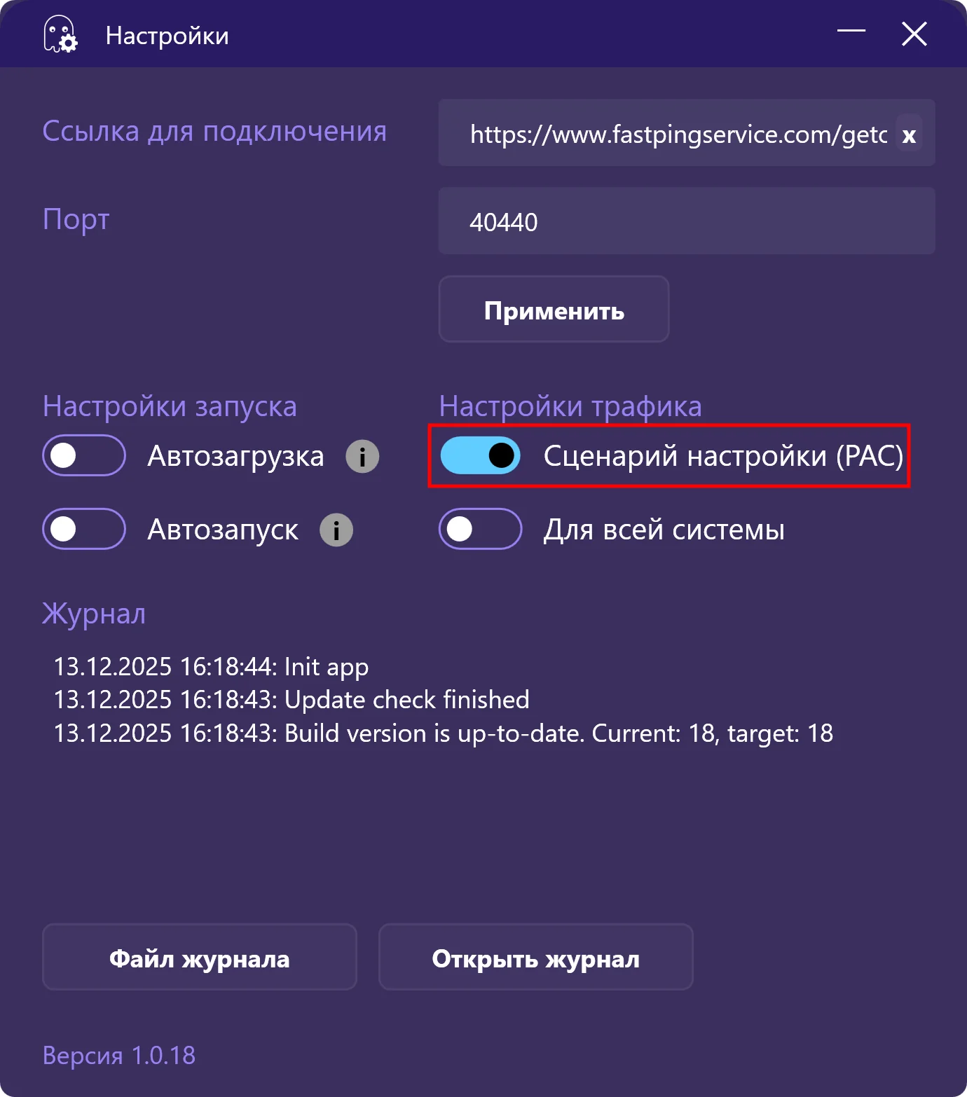 Для работы с терминалами, которые не имеют собственных встроенных настроек прокси, включите параметр Сценарий настройки (PAC) в окне настроек приложения fastpingservice. Затем произведите подключение, выбрав в контекстном меню пункт Подключить.