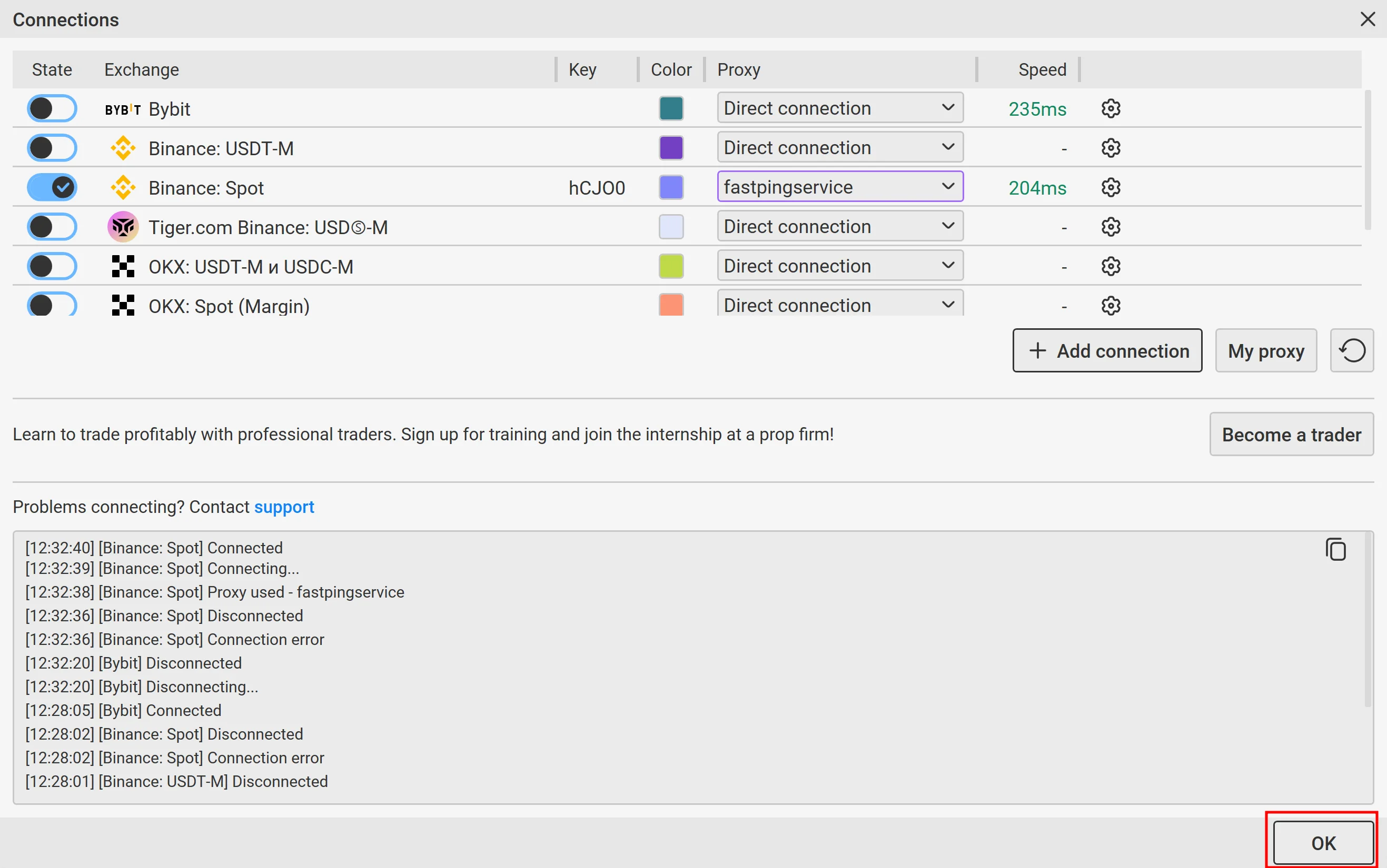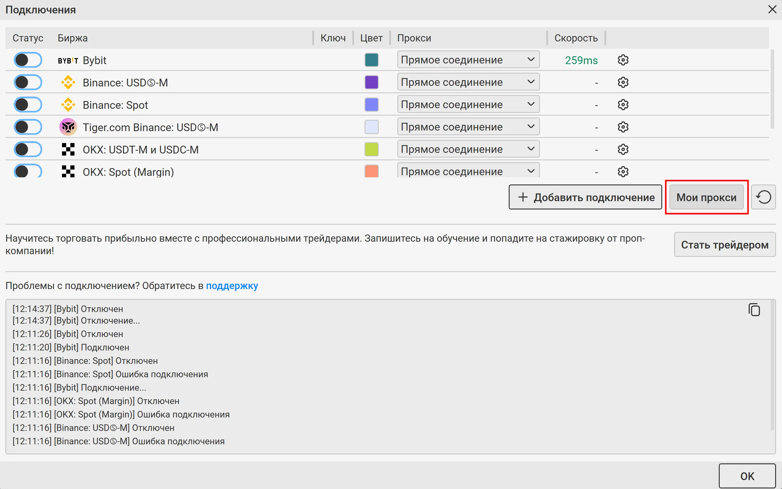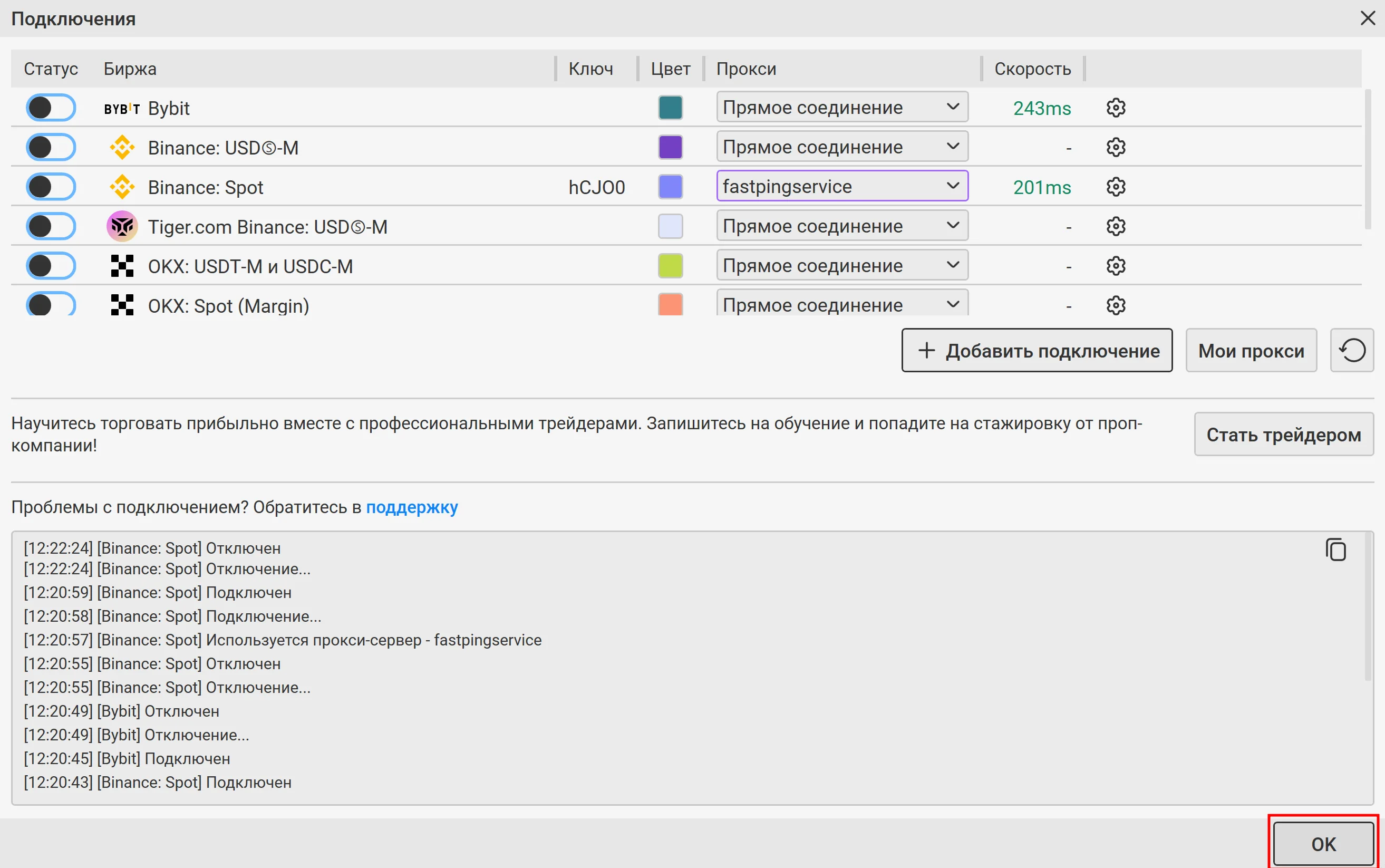 В окне Подключения из выпадающего списка справа выберите созданный вами ранее прокси. Подключение к бирже произойдет автоматически. Нажмите ОК, окно Подключения закроется.