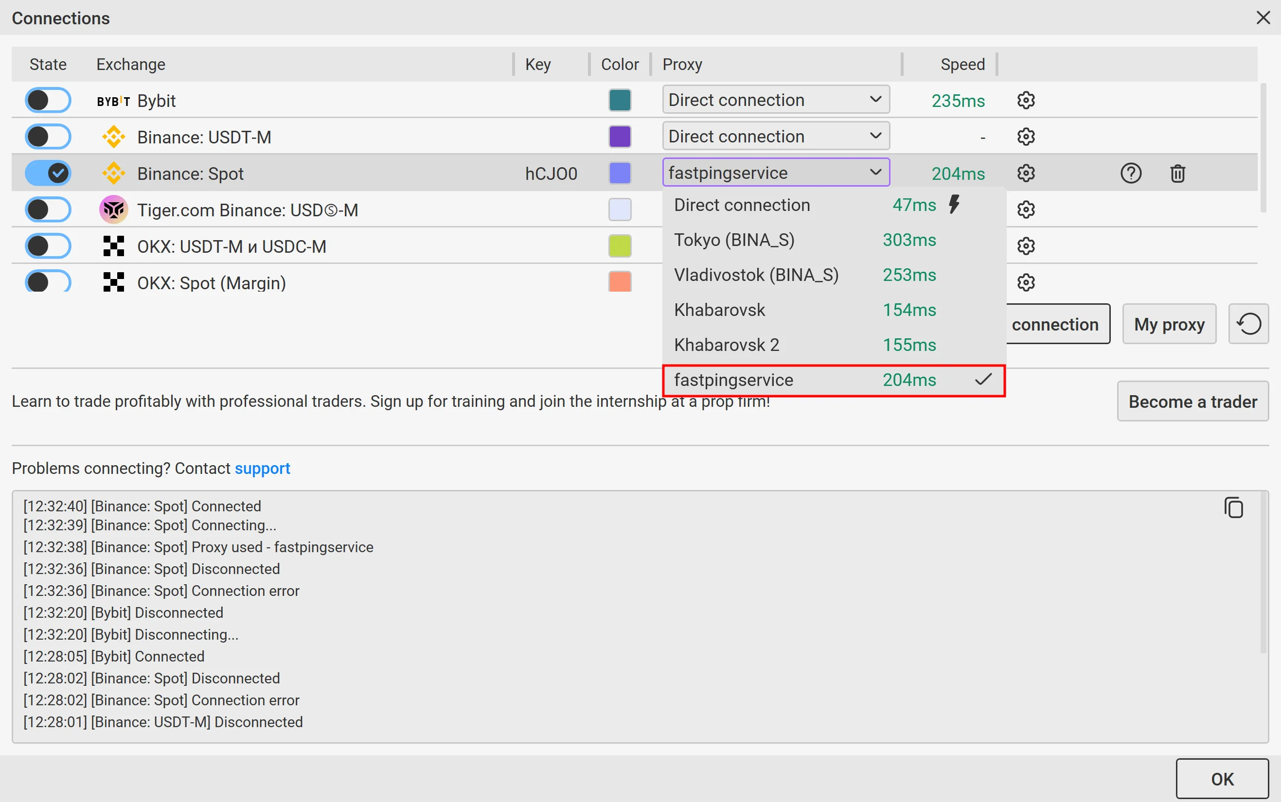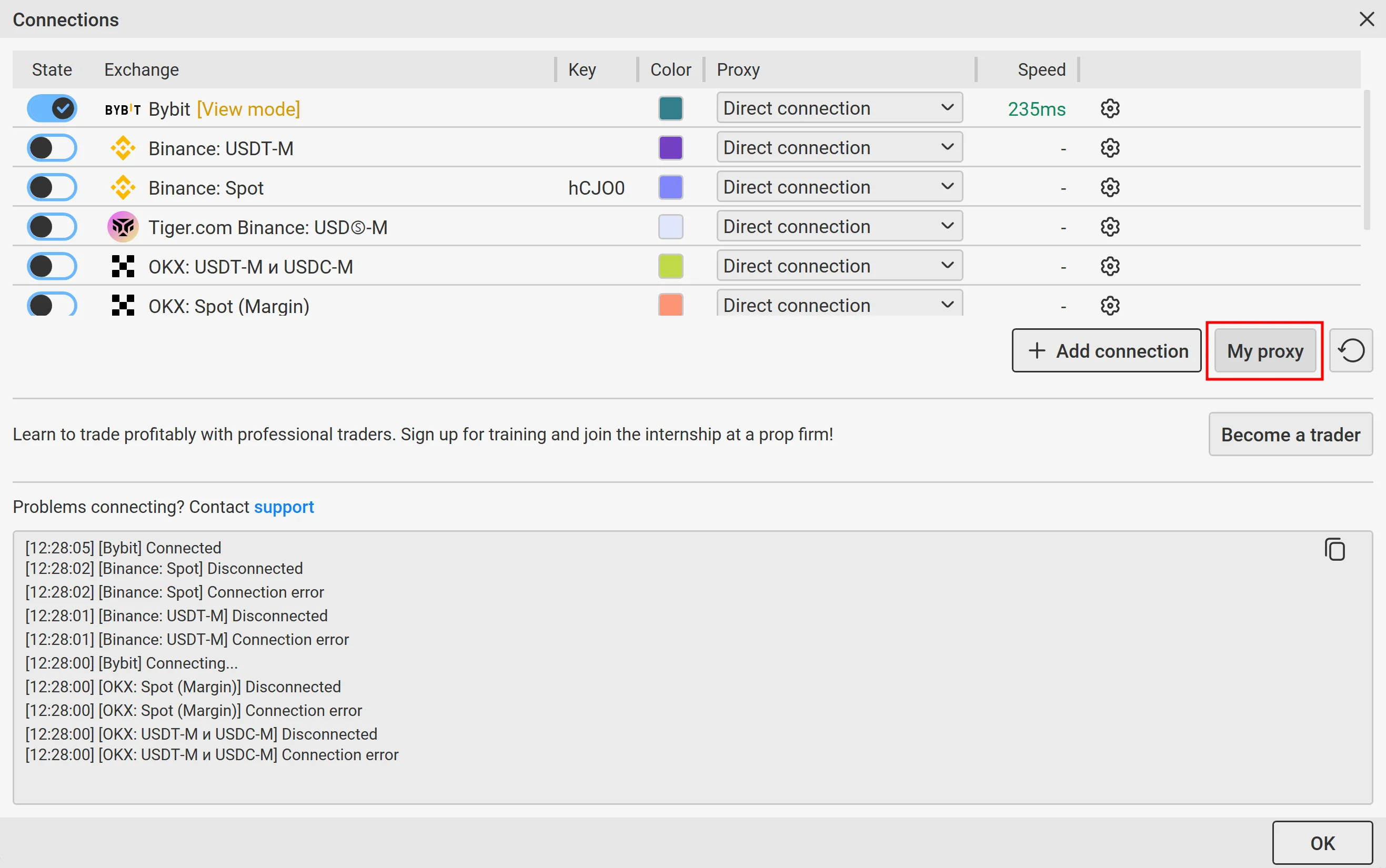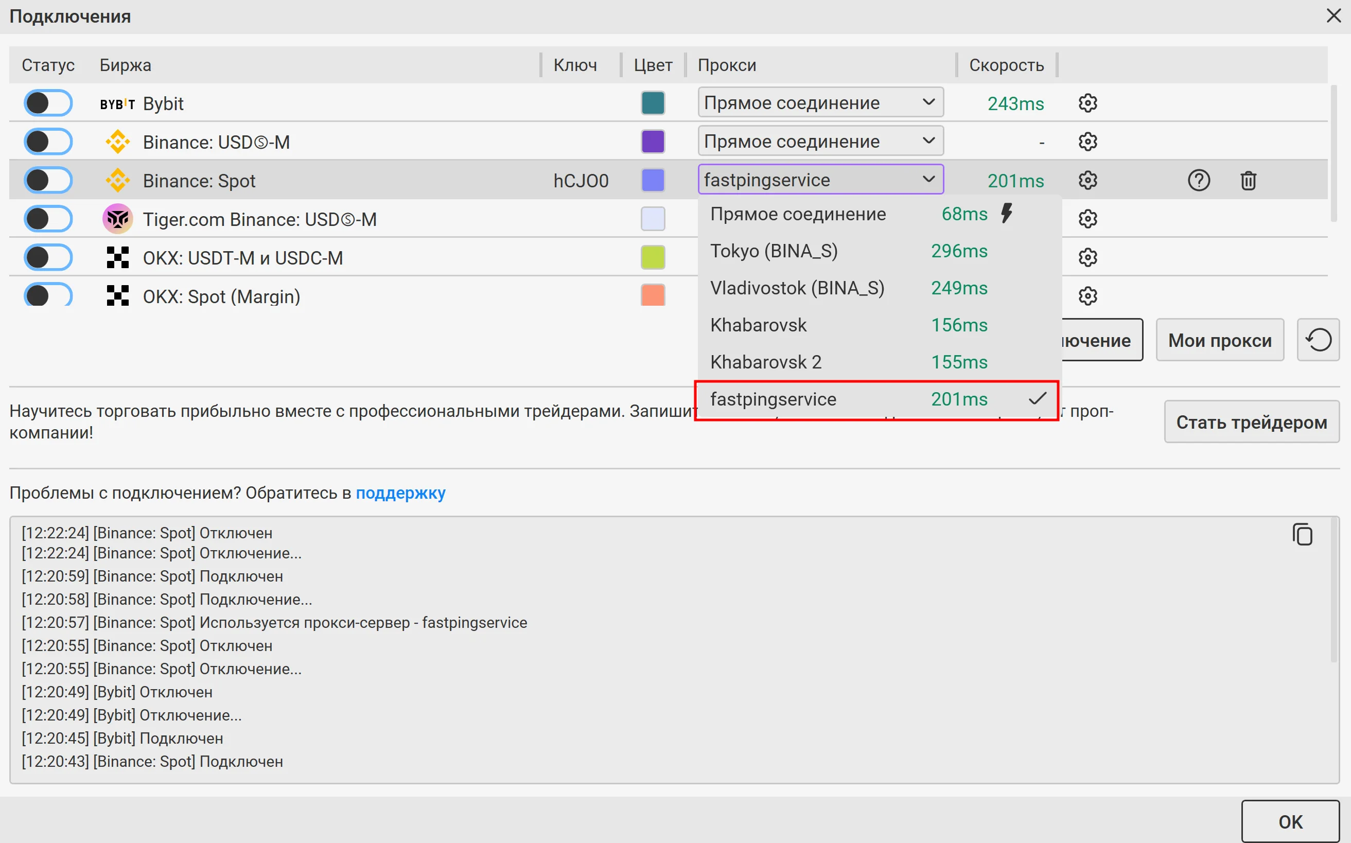 В окне Подключения из выпадающего списка справа выберите созданный вами ранее прокси. Подключение к бирже произойдет автоматически. Нажмите ОК, окно Подключения закроется.