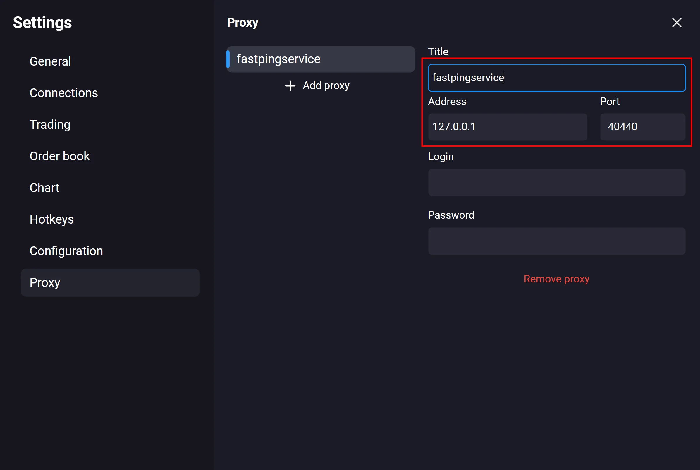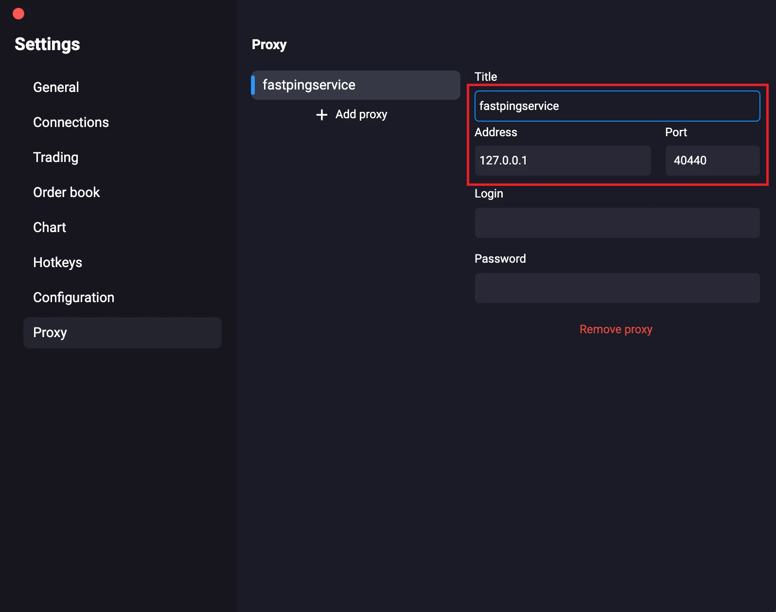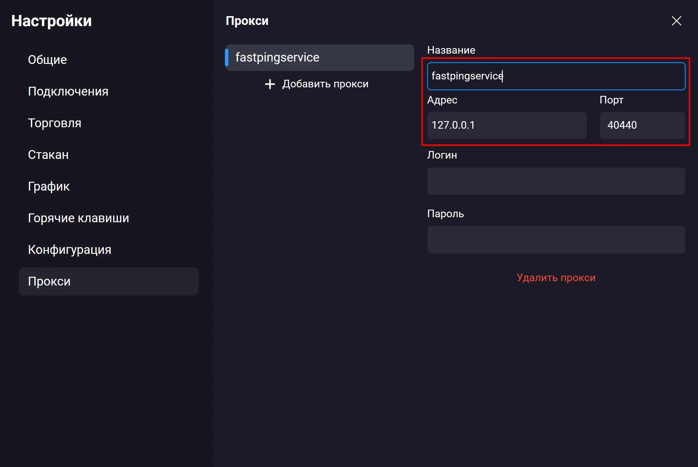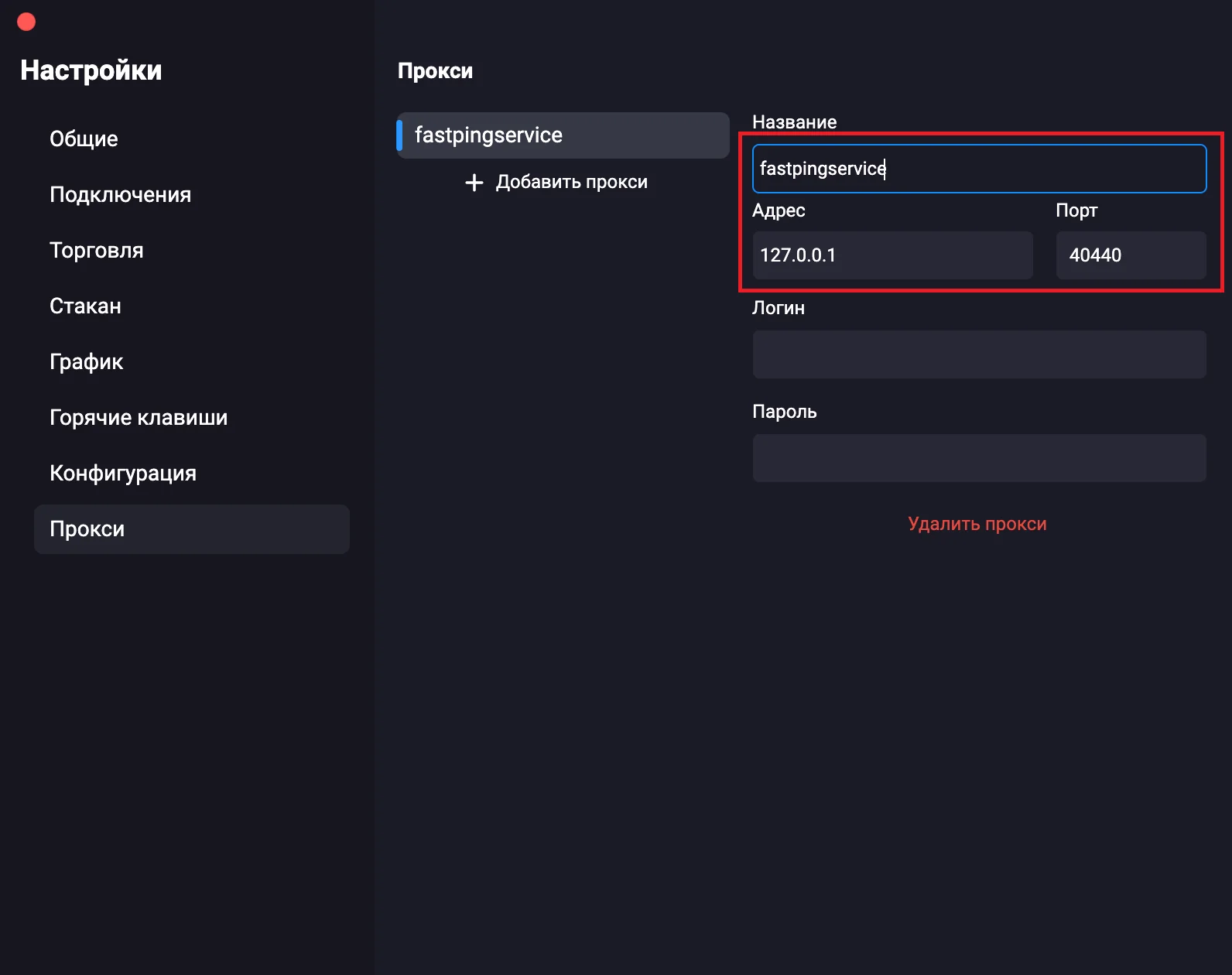 Нажмите на значок в виде шестеренки Открыть окно настроек в правом верхнем углу окна терминала. В появившемся окне выберите вкладку Прокси и нажмите Добавить прокси. В поле Название укажите название прокси. Рекомендуем изменить название на fastpingservice или любое другое понятное для вас название.