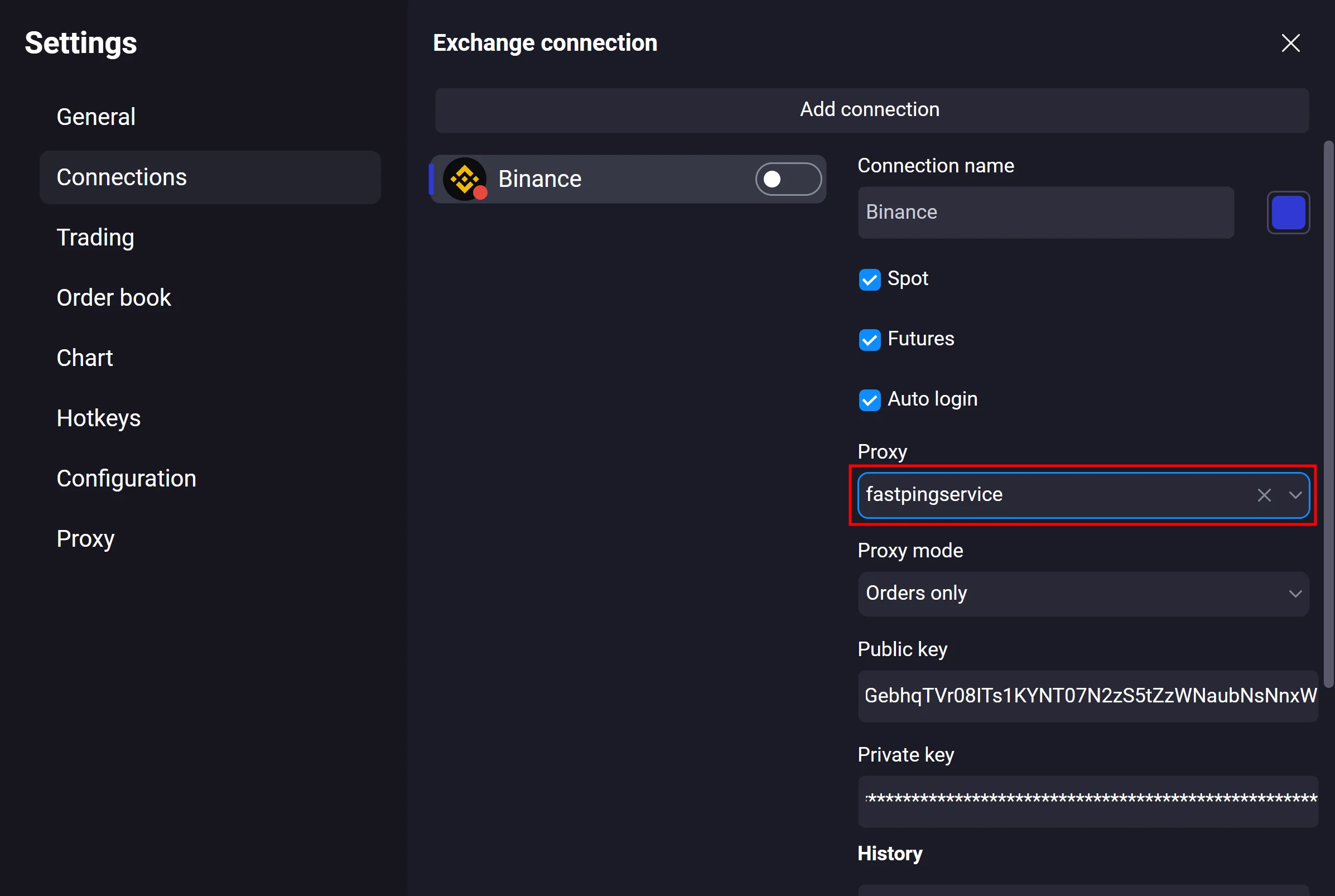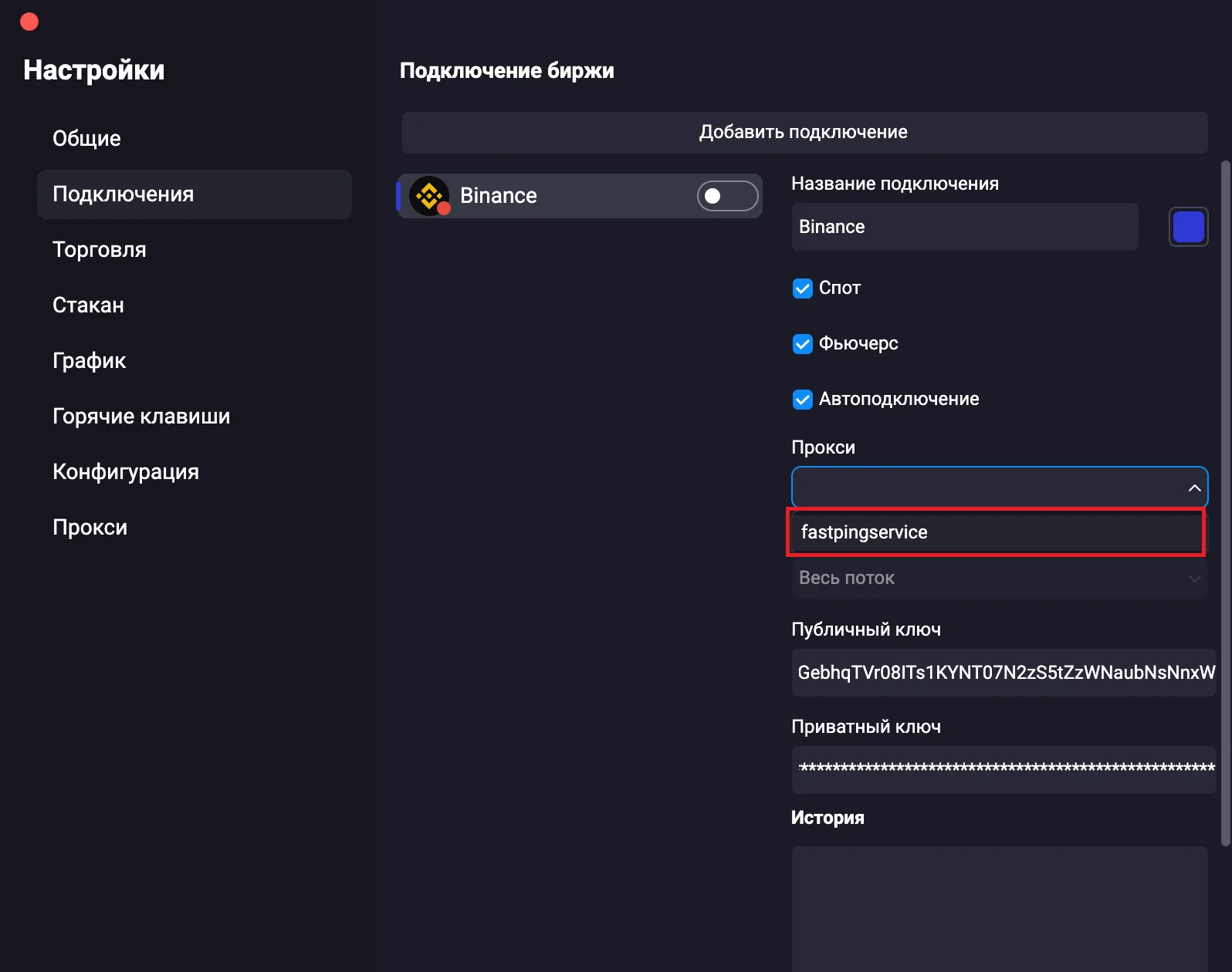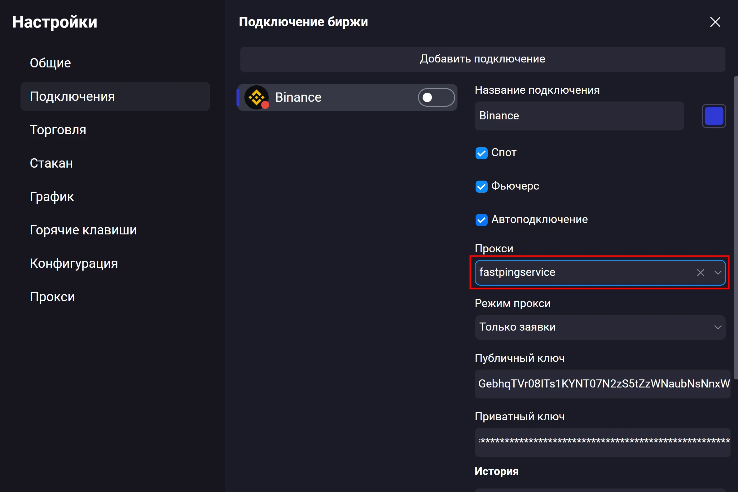 Перейдите во вкладку Подключения и нажмите Добавить подключение. Из выпадающего списка выберите необходимое подключение. В настройках выбранного подключения из выпадающего списка выберите созданный прокси.
