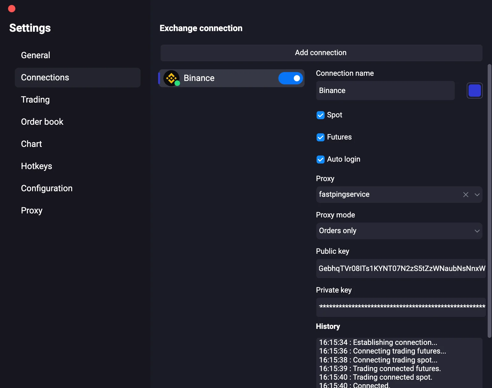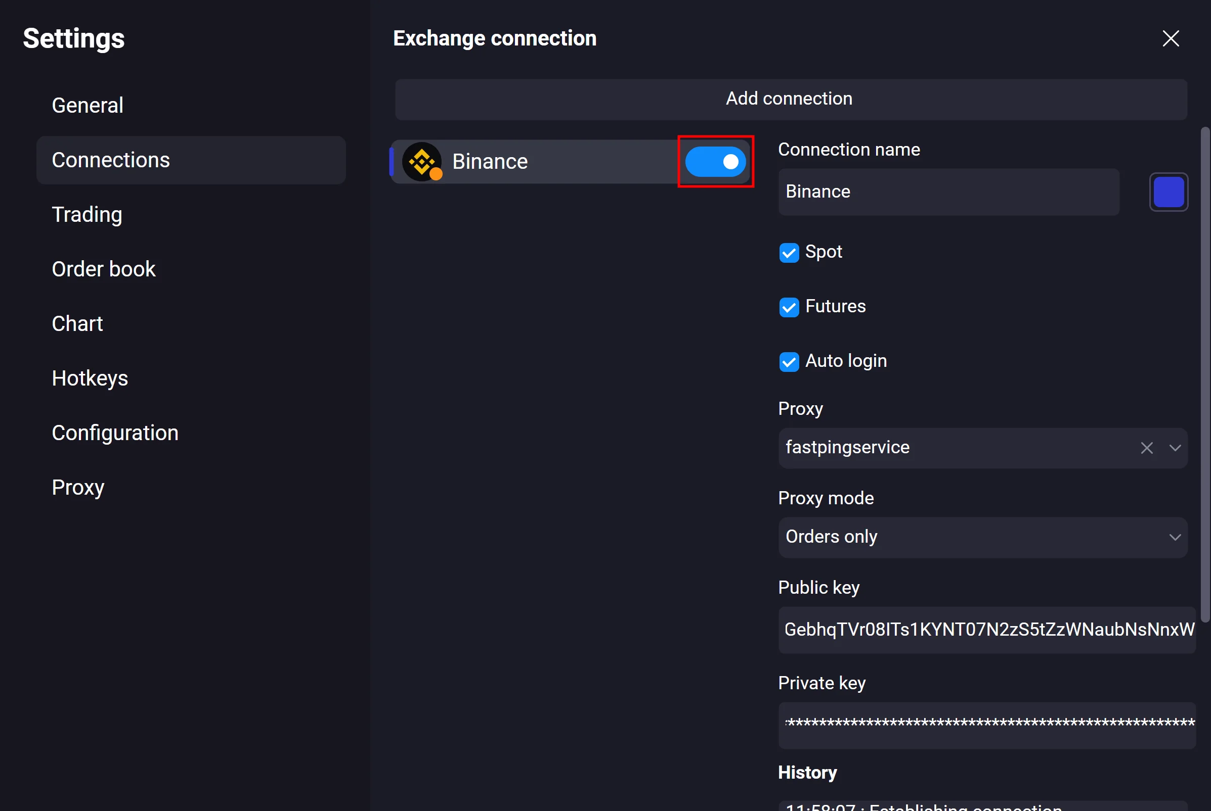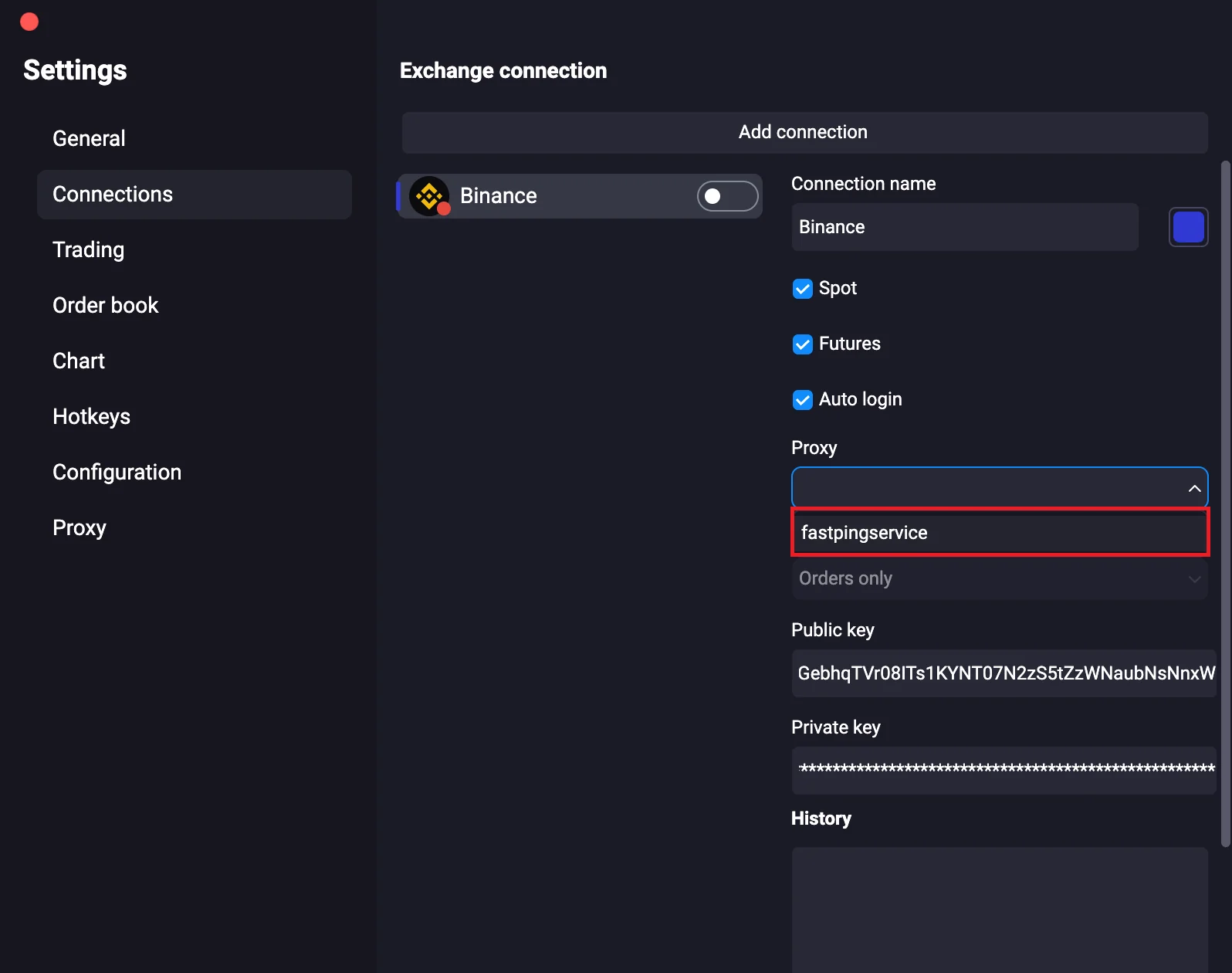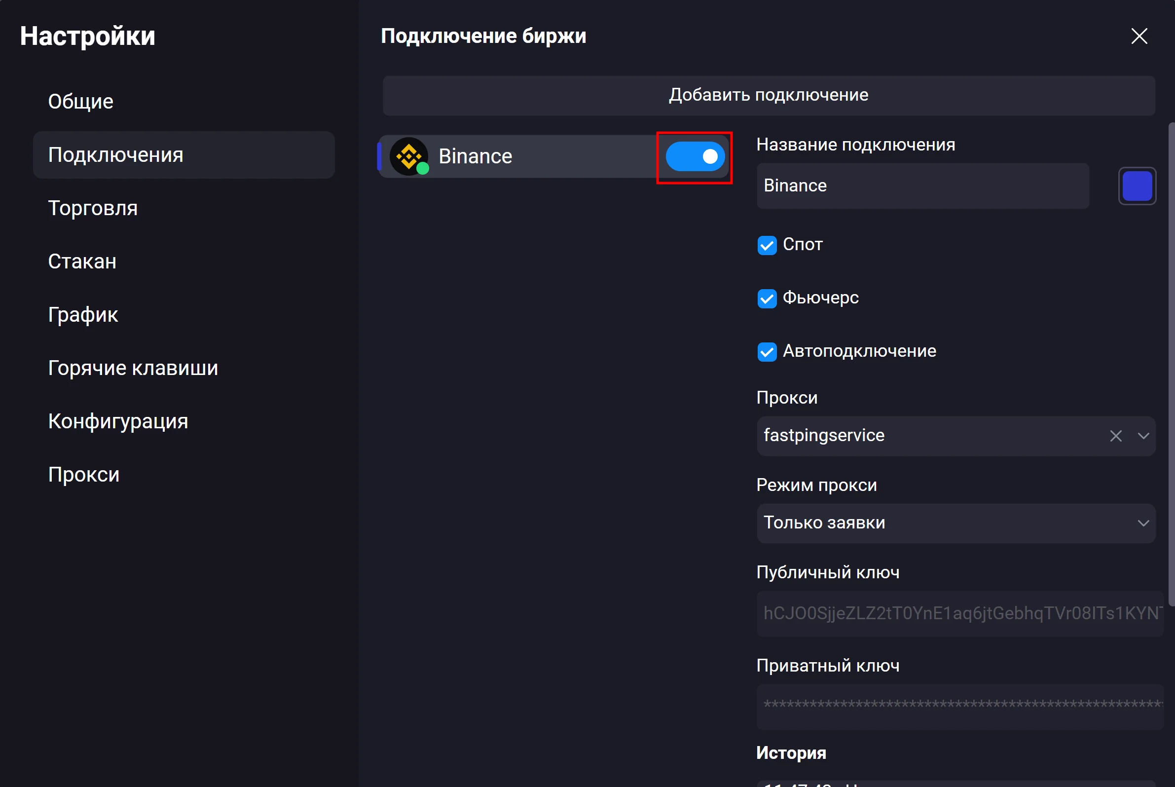 Перейдите во вкладку Подключения и нажмите Добавить подключение. Из выпадающего списка выберите необходимое подключение. В настройках выбранного подключения из выпадающего списка выберите созданный прокси.